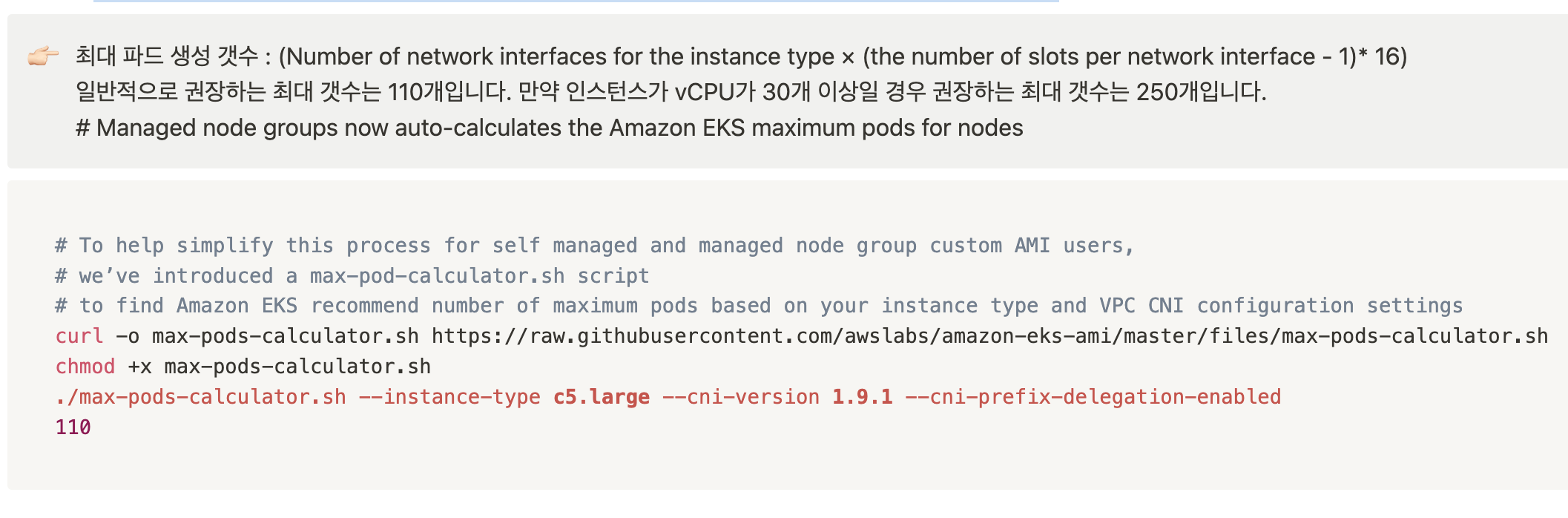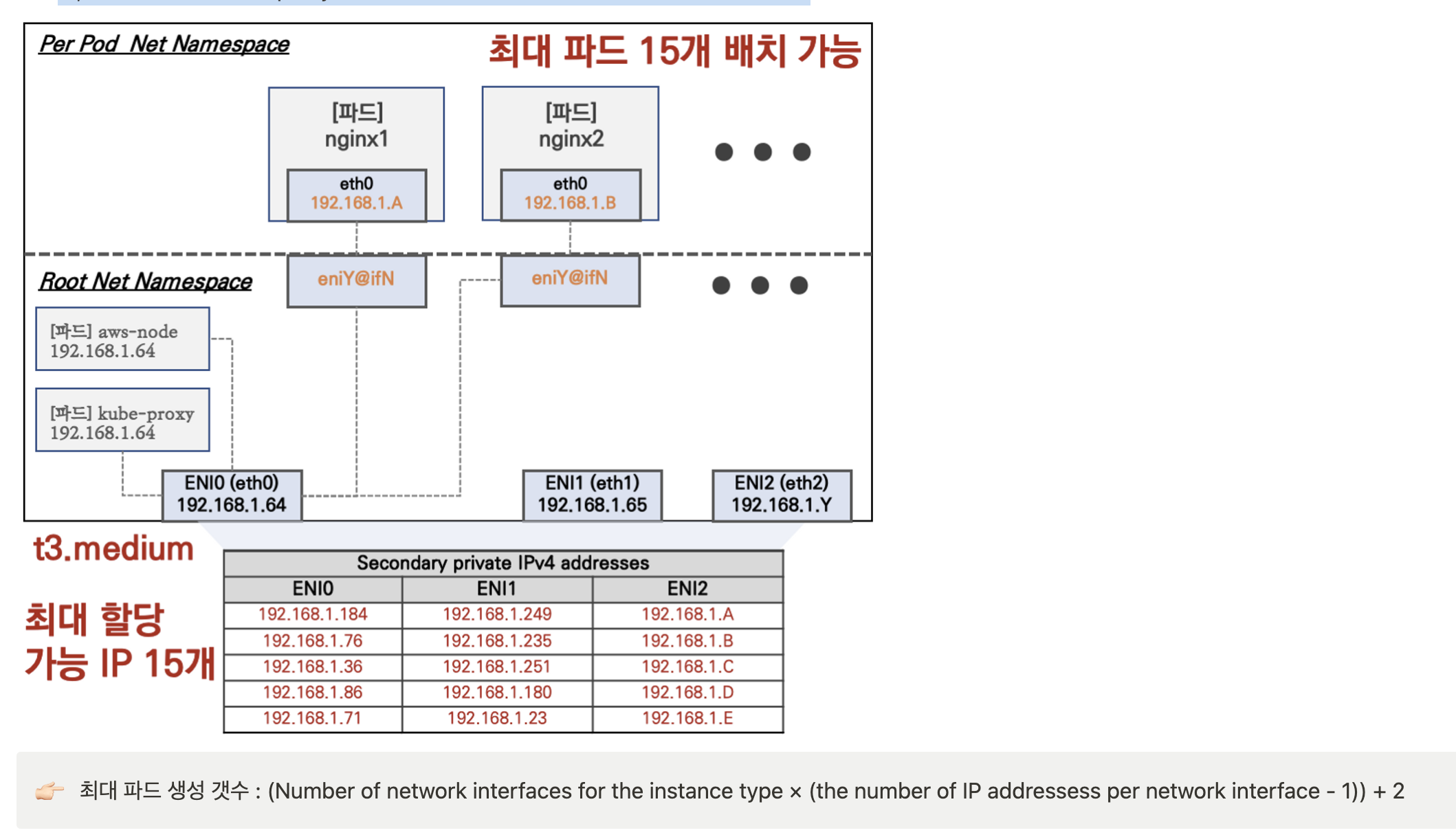 - 단, aws-node 와 kube-proxy 파드는 호스트의 IP를 사용함으로 최대 갯수에서 제외함