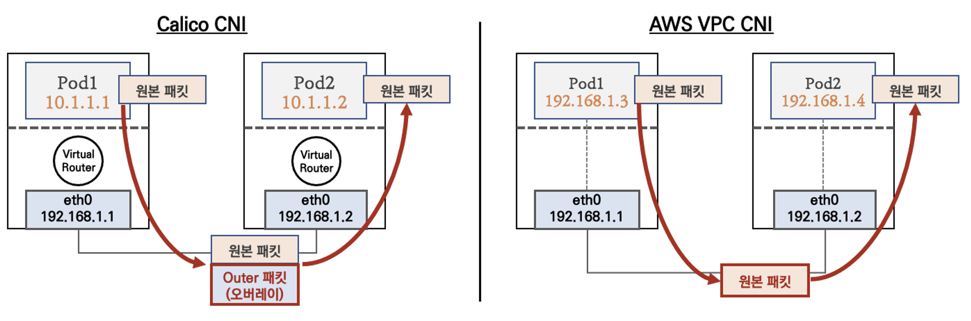 - 파드간 통신 시 일반적으로 K8S CNI는 오버레이(VXLAN, IP-IP 등) 통신을 하고, AWS VPC CNI는 동일 대역으로 직접 통신을 한다