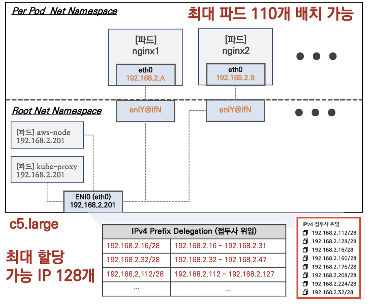 - IPv4 Prefix Delegation 대역의 IP를 파드가 사용 가능하다
