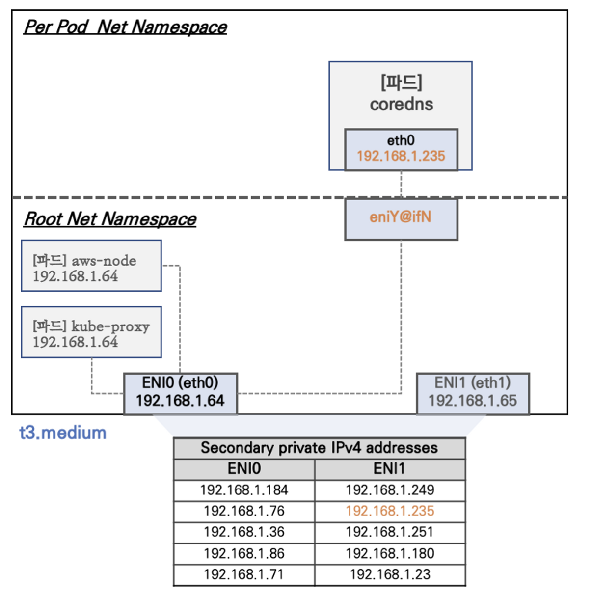 - coredns 파드는 veth 으로 호스트에는 eniY@ifN 인터페이스와 파드에 eth0 과 연결되어 있다