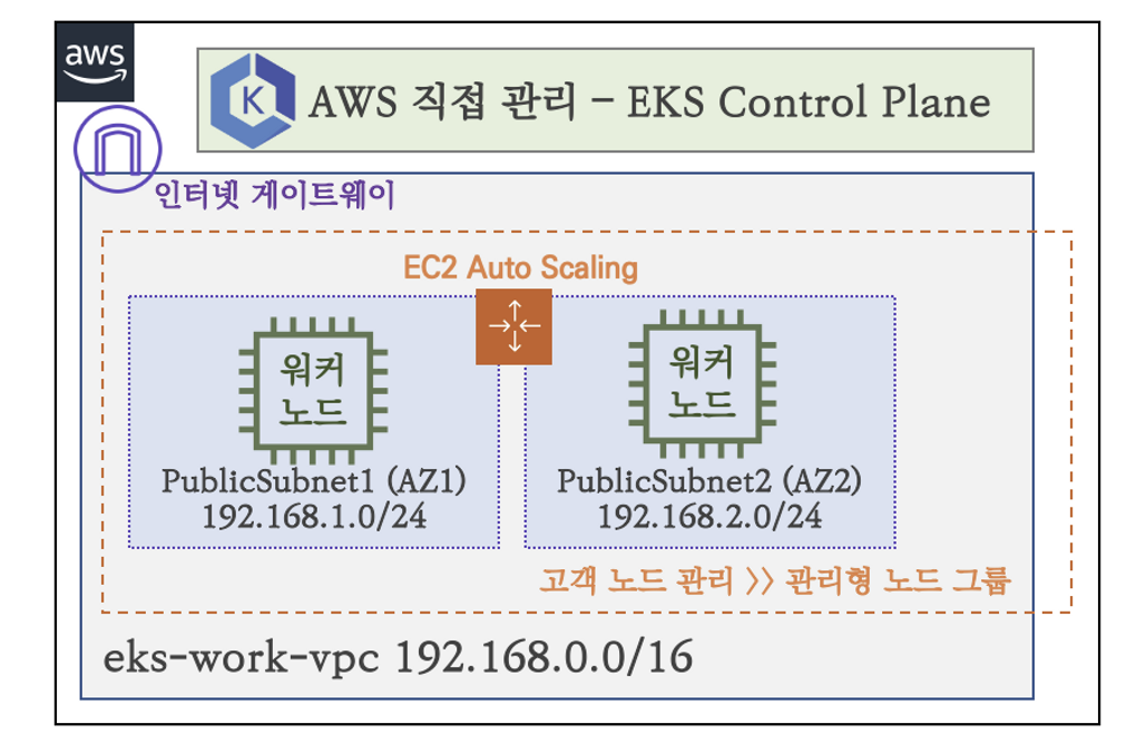 - AWS EKS 클러스터, 관리형 노드 그룹(t3.medium, 노드 2대